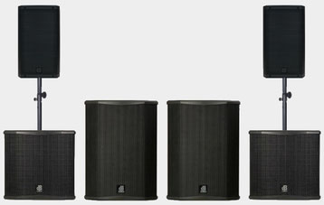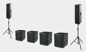 Aktives PA-Set mit vier horngeladenen Subwoofern. Ideal wenn druckvolle Bässe gefragt sind. Die vier Subwoofer liefern 134dB Schalldruck ab 28Hz bei einer